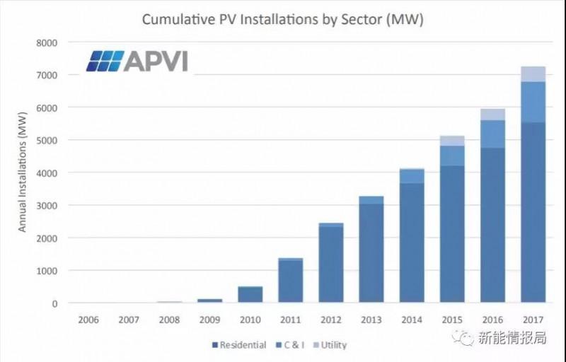 從2012-2016,澳大利亞的戶用裝機量一直在下滑,但是在2017年卻增長了44%,由541MW增加到了779MW。