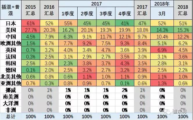 日本依靠普混優(yōu)勢較為突出,在17年到18年日本在普混和插混的共同份額保持在50%水平份額,。