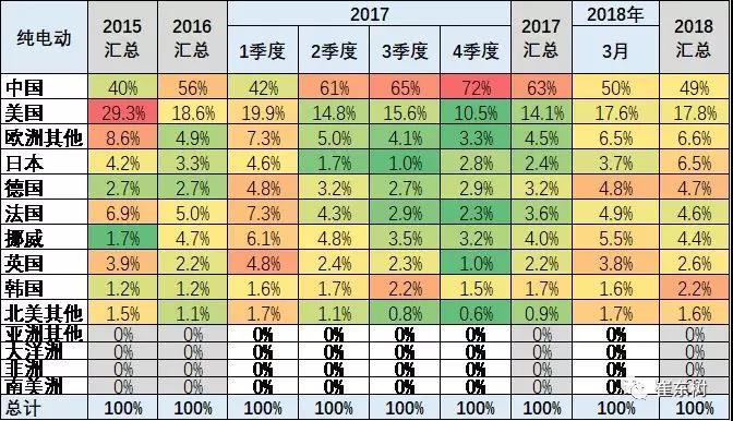 2018年1- 3月份,中國純電動乘用車的份額達到49%,較17年的1-3月份的42%份額大幅提升7個百分點。18年1到3月份,美國和法國德國等的新能源車市場份額同比都有所下降,而亞洲市場的日本和韓國的純電動車份額都有較好提升。