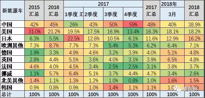 中國新能源車在世界市場的表現(xiàn)不斷的提升之中,16年在世界市場份額達到45%,17年中國的份額上升到47%,其中17年四季度達到59%的單位,18年1-3月份,中國新能源車占世界市場的份額達到37%,相比較17年1-3月份的21%,大幅提升了16個百分點。至于其他國家的形成和基本都處于下降之中,尤其是日本,從17年1到2分的24%下降到今年的21%,日本的新能源車新車優(yōu)勢,暫時放緩。