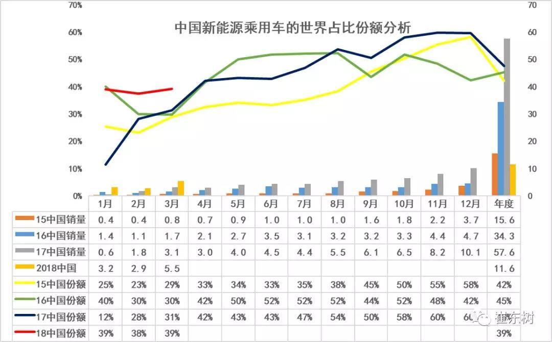 2018年一季度中國新能源乘用車的世界份額達到39%,,前三個月的份額基本保持在39%不變。這16年,中國新能源車在世界份額達到45%,17年達到48%,但是其中特征都是前低后高,的走勢,3月份的新車份額總體是中國相對較低的,2018年的份額在年初表現(xiàn)就特別突出,未來仍有增長潛力,,