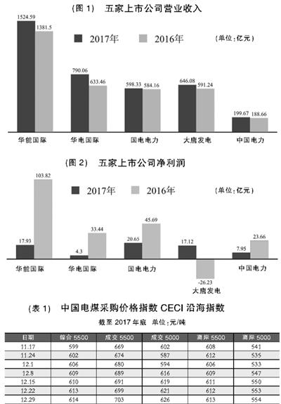 五大發(fā)電主要上市公司均為其所在集團(tuán)的火電資產(chǎn)整合平臺(tái),火電業(yè)務(wù)的經(jīng)營情況在公司整體業(yè)績中權(quán)重頗高。作為火電行業(yè)經(jīng)營成本的主要構(gòu)成部分,電煤價(jià)格在2017年全年保持高位運(yùn)行,絕大多數(shù)時(shí)間處于“紅色區(qū)間”,火電行業(yè)2016年出現(xiàn)的局部地區(qū)虧損演變?yōu)樾袠I(yè)普遍情況,并蔓延到資產(chǎn)優(yōu)質(zhì)的五大發(fā)電上市公司。