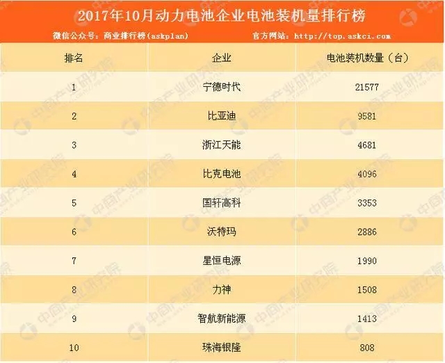 2017年10月動(dòng)力電池企業(yè)電池裝機(jī)量前十排名依次為寧德時(shí)代、比亞迪、浙江天能、比克電池、國(guó)軒高科、沃特瑪、星恒電源、力神、智航新能源、珠海銀隆。