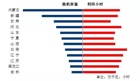圖6 1-10月份風(fēng)電裝機較多省份風(fēng)電裝機容量和設(shè)備利用小時