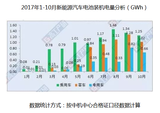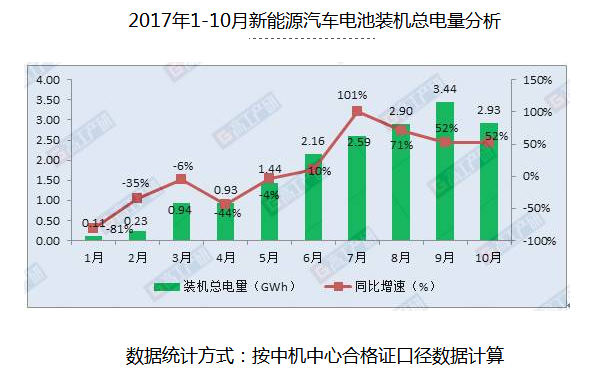 據(jù)GGII統(tǒng)計(jì)數(shù)據(jù)顯示,2017年10月動(dòng)力電池裝機(jī)總電量約2.93GWh,同比增長(zhǎng)52%,環(huán)比下降15%。