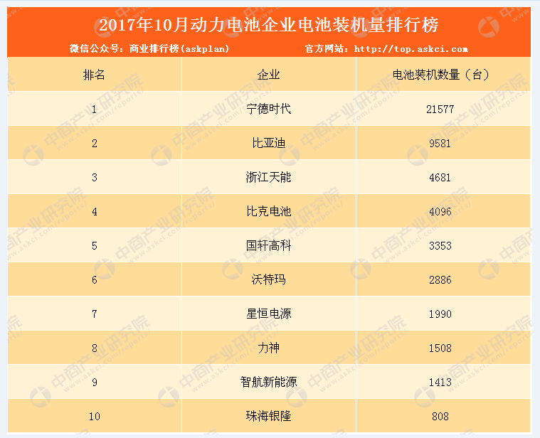 2017年10月動(dòng)力電池企業(yè)電池裝機(jī)量前十排名依次為寧德時(shí)代、比亞迪、浙江天能、比克電池、國(guó)軒高科、沃特瑪、星恒電源、力神、智航新能源、珠海銀隆。