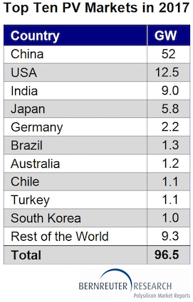Bernreuter Research的供應(yīng)側(cè)分析得到85個國家自下而上的光伏需求評估的支持,預(yù)計(jì)2017年全球安裝量為96.5GW,比2016年的超過74GW增長30%。另一個指標(biāo)是同樣的方向:通過從四大模塊供應(yīng)商晶科,阿特斯,晶澳太陽能和韓華Q電池的總體出貨指導(dǎo)中推算出全球需求,貝納特勒研究在2017年得出了類似的結(jié)果。