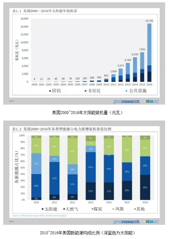 根據(jù)咨詢公司GTMResearch與美國太陽能工業(yè)學會最新發(fā)布的數(shù)據(jù),2016年美國光伏發(fā)展迅猛,全年新增裝機達到14.7吉瓦,比2015年增加近1倍。太陽能發(fā)電已經(jīng)成為美國最大的新能源利用方式,光伏裝機歷史上首次超越其他電源新增裝機,占全年新增裝機的39%(燃氣發(fā)電占29%,風電占26%)。