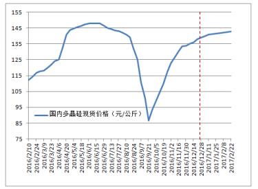 圖1 2016年2月-2017年2月國內(nèi)多晶硅現(xiàn)貨價格 來源:硅業(yè)分會
