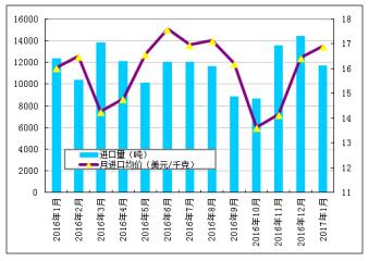 圖3 2016年1月-2017年1月多晶硅進口量及進口均價示意圖 數(shù)據(jù)來源:海關(guān)