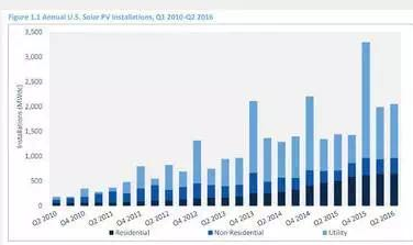 除了公共事業(yè)規(guī)模項(xiàng)目,2016年第二季度住宅和工商業(yè)板塊勢(shì)頭都很足。第二季度住宅裝機(jī)量同比增長(zhǎng)29%,GTMResearch認(rèn)為雖然加利福尼亞州裝機(jī)小幅下滑,但猶他州和德克薩斯州的增長(zhǎng)彌補(bǔ)了這點(diǎn)兒損失。