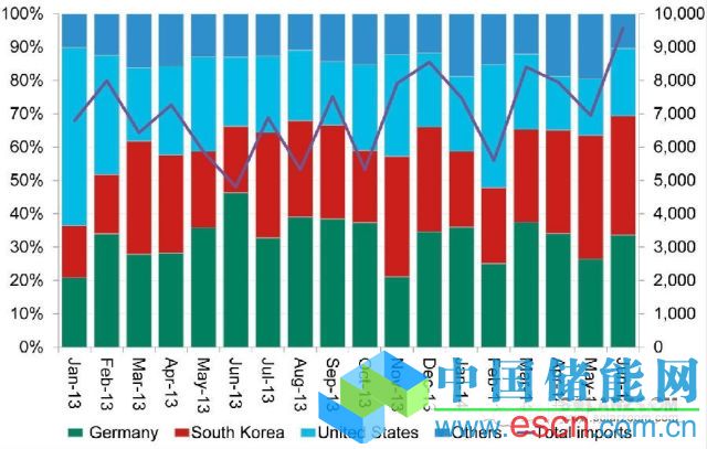 中國儲(chǔ)能網(wǎng)訊:2014上半年中國進(jìn)口多晶硅4.6萬噸,較去年同期增加17.4%。其中84%來自三個(gè)出口國:美國(21.8%),韓國(30.0%),德國(32.6%)。盡管中國在今年1月公布了對從美國和韓國進(jìn)口的多晶硅將征收懲罰性關(guān)稅,但實(shí)際情況中幾乎所有這兩國出口到中國的多晶硅都通過加工貿(mào)易(來料加工或進(jìn)料加工)的渠道避免了關(guān)稅。