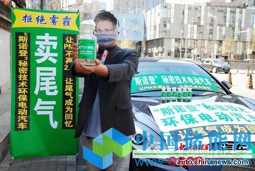 在叫賣尾氣的現(xiàn)場,記者見到一輛被改裝為電動車的、疑似保時捷的車輛,車身披掛著“斯諾登秘密技術(shù)環(huán)保電動汽車讓PM不再2.5、讓尾氣成為回憶”、“拒絕霧霾”等字樣,一位提供電動汽車全面技術(shù)的機構(gòu)工作人員,戴著面具以及防霾口罩,在電動車旁舉著一個1000毫升容積的玻璃罐子叫賣。據(jù)該人士稱,罐子里密封的是剛從燃油車排氣管口收集到的“新鮮”尾氣。據(jù)稱這樣一瓶“收藏專用”尾氣象征性地僅售5元錢。