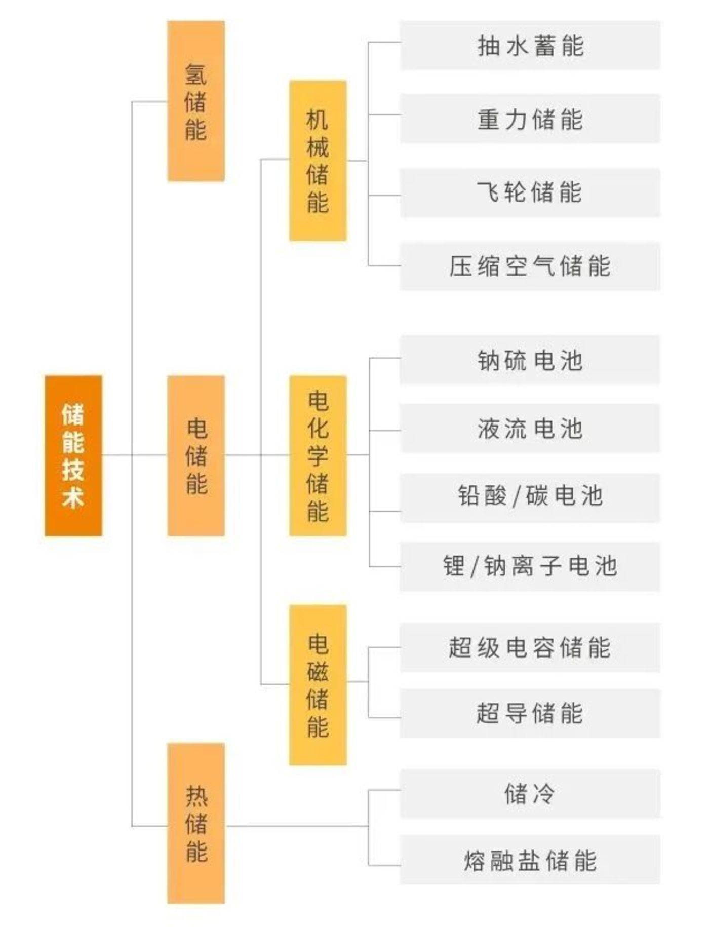 按照儲能原理和技術(shù)的不同,儲能技術(shù)可劃分為電儲能、熱儲能和氫儲能三大類。其中除抽水蓄能外的儲能技術(shù)行業(yè)統(tǒng)稱為新型儲能,主要包括鋰離子電池、液流電池、壓縮空氣儲能、飛輪儲能、氫(氨)儲能等。相對于抽水蓄能,新型儲能普遍具有建設周期短、選址靈活、響應快速、調(diào)節(jié)能力強等優(yōu)勢,能夠為電力系統(tǒng)提供更多時間尺度的調(diào)控能力。