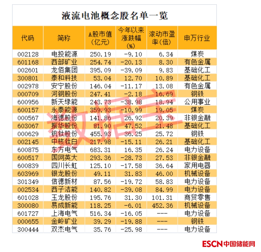 證券時報·數(shù)據(jù)寶統(tǒng)計,A股市場上布局液流電池業(yè)務(wù)的公司有23家,超半數(shù)公司今年前三季度凈利潤同比增長。易成新能、泰和科技、海德股份、永泰能源等凈利潤翻倍增長。從估值水平來看,截至11月4日收盤,逾六成概念股滾動市盈率低于30倍。電投能源、西部礦業(yè)、龍佰集團(tuán)等3股滾動市盈率低于10倍。