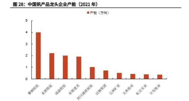據(jù)某機(jī)構(gòu)統(tǒng)計,國內(nèi)釩產(chǎn)品產(chǎn)能合計 17.14 萬噸(2021 年底),釩產(chǎn)品生產(chǎn)的前十大企業(yè)分別是攀鋼釩鈦、承德釩鈦、成渝釩鈦、承德建龍、四川德勝釩鈦、 達(dá)鋼集團(tuán)、五洲礦業(yè)、玉典釩業(yè)、虹京實業(yè)、宏發(fā)釩業(yè)。
