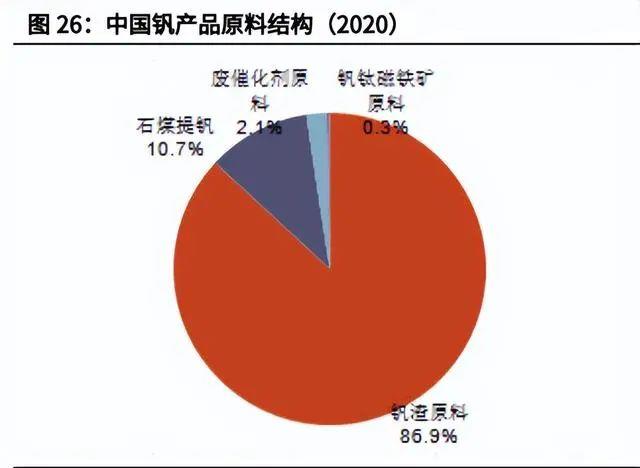 原料及工藝:國際以釩鈦磁鐵礦為主,國內(nèi)以釩渣為主 。釩的地殼豐度雖然較高,但卻主要與其他礦物形成共生礦或者復(fù)合礦,獨立 釩礦較少見。目前世界上發(fā)現(xiàn)的含釩礦物有 70 多種,釩礦主要有以下三種:(1)釩鈦磁鐵礦:釩鈦磁鐵礦中的釩主要以 FeO·V2O3 尖晶石形態(tài)存在, 礦中含釩 0.2%~1.5%。除美國外,主要產(chǎn)釩國家都是從釩鈦磁鐵礦中提取釩。(2)鉀釩鈾礦:鉀釩鈾礦是一種鉀鈾的釩酸絡(luò)鹽,它的化學(xué)式為 K2O·2UO3·V2O5·1~3H2O,呈淺黃色或淺綠黃色,其中五氧化二釩含量可達(dá) 20.16%,美國是這種礦物的主要產(chǎn)地。(3)石油伴生礦:石油伴生礦寄生在原油中,主要分布于南美洲。據(jù)吳優(yōu)等人發(fā)布的《2020 年全球釩工業(yè)發(fā)展報告》,世界釩產(chǎn)品原料的絕 大部分均來自于釩鈦磁鐵礦,大多數(shù)國家都是通過釩鈦磁鐵礦在煉鋼的時候,從 含釩鋼渣中繼續(xù)提煉釩,包括中國、俄羅斯等,而美國主要從石油渣、煤灰、廢 催化劑等中提煉。2020 年全球約 74.8%的釩來自于釩鈦磁鐵礦經(jīng)鋼鐵冶煉后得到的富釩鋼渣,直接從釩鈦磁鐵礦提取釩的占比 13.8%,11%由回收的含釩副 產(chǎn)品(含釩燃油灰渣、廢化學(xué)催化劑等)及含釩石煤提取。