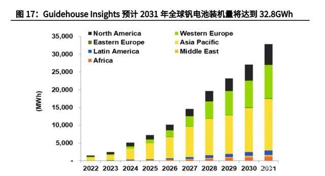 Guidehouse Insights 于 2022 年二季度發(fā)布的《Vanadium Redox Flow Batteries :Identifyting Market Opportunities and Enablers》報告顯示, 2022-2031 年釩電池年裝機(jī)量有望保持 41%的復(fù)合增長率,預(yù)計 2031 年全球釩電池年裝機(jī)量將達(dá)到 32.8GWh;其中,2031年亞太地區(qū)(主要為中國)年裝機(jī) 量將達(dá)到約 14.5GWh,北美地區(qū)將達(dá)到 5.8GWh,西歐地區(qū)將達(dá)到 9.3GWh。