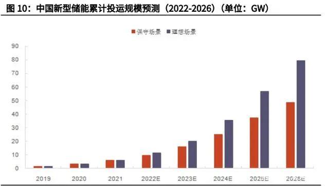 預(yù)計 2026年我國新型儲能累計裝機(jī)規(guī)模達(dá)到 48.5GW 和 79.5GW(分別為 保守和理想情況)。據(jù)數(shù)據(jù)統(tǒng)計, 2021年我國新型儲能累計裝機(jī)規(guī)模為 5.73GW。據(jù) CNESA 的預(yù)測,在保守場景下,到 2026年新型儲能累計規(guī)模達(dá)到 48.5GW,2021-2026 年的復(fù)合年均增長率為 53.3%;理想場景下,累計裝機(jī)將 達(dá)到 79.5GW,2021-2026 年的復(fù)合年均增長率為 69.2%。