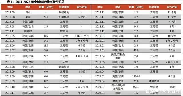 由于鋰離子電池的能量密度占優(yōu)以及成本的不斷下降,近幾年鋰電池在儲能 領(lǐng)域迅速推廣,但與此同時,鋰電池儲能爆炸的事故也在增加。根據(jù)我們的統(tǒng)計, 2011-2022 年 4 月全球共計發(fā)生 34 起儲能電站爆炸事件,其中,日本 1 起、比 利時 1 起、中國 3 起、美國 4 起、韓國 25 起。從爆炸的電池類型來看,仍以鋰電池為主,合計 32 起,占比 94%,剩余為美國 1起鉛酸電池,日本 1起鈉硫電池;而 2017年以來的儲能爆炸事件均為鋰電池爆炸。