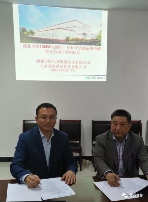 中國儲能網訊:2017年10月18日,舉世矚目的中國共產黨第十九次全國代表大會在北京開幕,在喜迎十九大勝利召開之際,北京普能(以下簡稱“普能”)總裁黃綿延與湖北棗陽平凡釩氮合金有限公司董事長謝光國、北京能高總經理金成日在中共棗陽市委常委、棗陽市人民政府副市長陳棟,襄陽市經信委新能源新材料辦公室蘇同劭主任等領導的見證下,共同簽署了全釩液流電池儲能產業(yè)技術研究院暨湖北棗陽10MW光儲用一體化示范項目相關合作文件,正式宣告該項目的啟動。