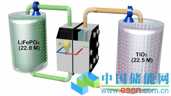 為了解決這個(gè)問(wèn)題,由新加坡國(guó)立大學(xué)的材料科學(xué)家研究人員Qing Wang領(lǐng)導(dǎo)的研究團(tuán)隊(duì),想出了一個(gè)混合的解決方案。他們保持整個(gè)流體電池架構(gòu),通過(guò)中心電極堆棧分隔電荷存儲(chǔ)槽。但在他們放置固體的外部槽內(nèi)部——與液體截然相反——鋰離子存儲(chǔ)材料,包含普通鋰離子電池使用的陽(yáng)極磷酸鐵鋰材料,另含有二氧化鈦(TiO2),有時(shí)被用作鋰離子電池陽(yáng)極。然后他們使用被稱為氧化還原介質(zhì)的帶電液體,從固體到堆棧間來(lái)回運(yùn)載電荷。固態(tài)存儲(chǔ)材料是多孔足以讓液態(tài)氧化還原介質(zhì)鼓泡并攫取兩個(gè)電極和鋰離子,將它們擺渡到隔離膜。
