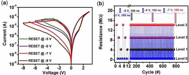 雖然基于給體受體型的有機(jī)非易失性存儲(chǔ)器具有低功耗、高的翻轉(zhuǎn)速度、良好的抗疲勞性和極好的尺寸擴(kuò)展?jié)摿亩徽J(rèn)為是新興的下一代存儲(chǔ)器候選對(duì)象。但是,基于給體受體型的有機(jī)材料的電阻轉(zhuǎn)變過程難以控制,轉(zhuǎn)變參數(shù)分布較寬,從而導(dǎo)致最終的RRAM器件狀態(tài)的誤讀和編程錯(cuò)誤。因此,找到一種對(duì)電阻變化過程可控的方法對(duì)于有機(jī)RRAM器件應(yīng)用極為重要。