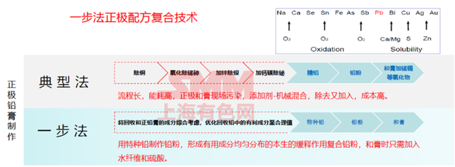 傳統(tǒng)的鉛酸電池正極鉛膏(鉛膏是鉛酸蓄電池活性物質(zhì)的母體)制作流程長,能耗高,正極和膏現(xiàn)場污染程度大,添加劑采用機械混合,成本也相對高昂。而新的“一步法正極配方復合技術(shù)”則是用特種鉛制作粉,形成有用成分均勻分布的復合鉛粉,和膏時只需加入水纖維和硫酸。