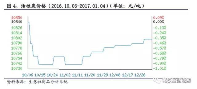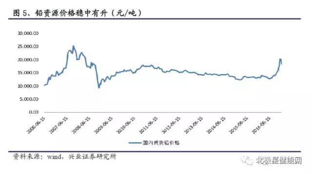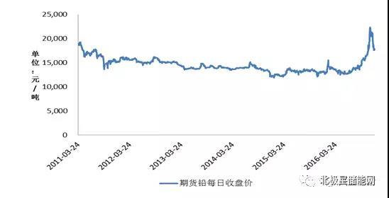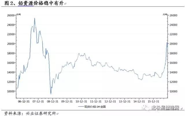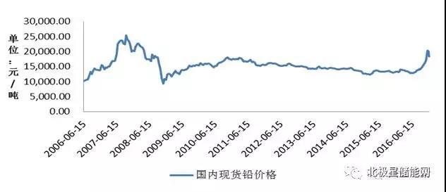 從圖4中可以看到,2016年下半年,活性炭價(jià)格先有一個(gè)明顯下跌,之后緩慢回升。此系列的上一篇報(bào)告中分析可以知道,近些年來鉛資源的價(jià)格大體呈先較為穩(wěn)定的狀態(tài),但在近半年價(jià)格有一定幅度的提升,具體走勢(shì)圖見圖5。