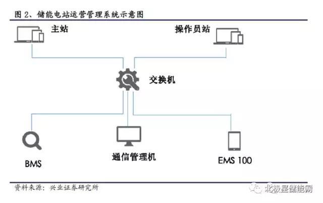 儲(chǔ)能系統(tǒng)中,除了電池的應(yīng)用以外,還涉及到了電池管理系統(tǒng)(BMS)以及過程控制系統(tǒng)(PCS)等。BMS主要用于估測(cè)動(dòng)力電池組的荷電狀態(tài),即電池剩余電量;在電池充放電過程中進(jìn)行動(dòng)態(tài)監(jiān)測(cè)等,是電池能量管理系統(tǒng)中的一項(xiàng)關(guān)鍵技術(shù)。圖2展示了儲(chǔ)能電站運(yùn)營管理系統(tǒng)的示意圖。