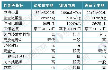 鐵路機(jī)車用蓄電池產(chǎn)品主要包括鉛酸電池、鎳鎘電池和鋰電池。根據(jù)電池容量、充放電壽命、安全性和技術(shù)成熟度幾個(gè)指標(biāo)對(duì)鐵路機(jī)車用蓄電池的產(chǎn)品性能進(jìn)行比較分析如下:
