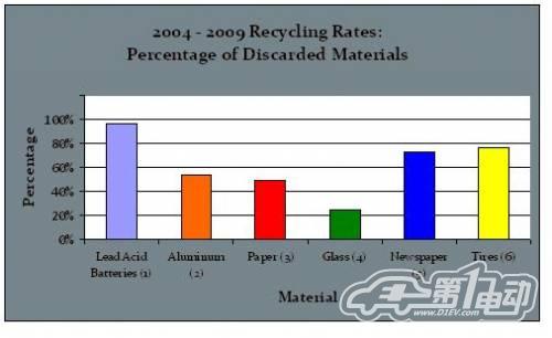 美國環(huán)保署(EPA)、美國鋁業(yè)協(xié)會(Aluminum Association)、美國林業(yè)及紙業(yè)協(xié)會(American Forest and Paper Association)、橡膠制造協(xié)會(Rubber Manufacturing Association)和美國廢物循環(huán)利用協(xié)會(Institute of Scrap Recycling Industries)等組織發(fā)布的數(shù)據(jù)顯示,2004年至2009年之間,美國鉛酸電池回收率達(dá)97%,遠(yuǎn)高于鋁、紙張、玻璃、報(bào)紙和輪胎等物質(zhì)的回收率。(見下圖)