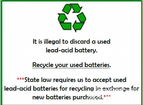 (標(biāo)志內(nèi)容:隨意丟棄廢舊鉛酸電池是違法行為,應(yīng)對鉛酸電池進(jìn)行回收。州法律規(guī)定,消費(fèi)者購買新鉛酸電池時(shí),須用舊電池交換,電池零售商負(fù)責(zé)回收舊電池)