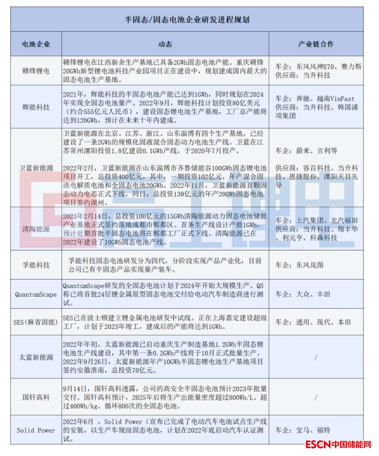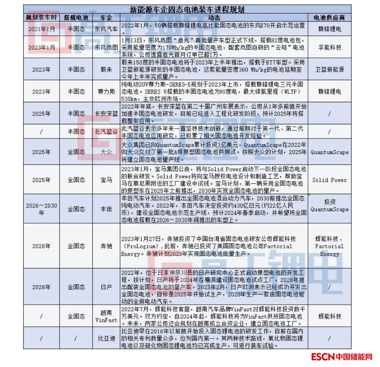 可以看出,東風(fēng)、蔚來(lái)、賽力斯已宣布將于今年實(shí)現(xiàn)半固態(tài)電池裝車,長(zhǎng)安深藍(lán)、智己、埃安、高合等車企普遍規(guī)劃2025年前裝車半固態(tài)電池,大眾、寶馬、豐田、奔馳、日產(chǎn)、越南VinFast等品牌也計(jì)劃在2025~2030年間推出搭載全固態(tài)電池的動(dòng)力汽車。
