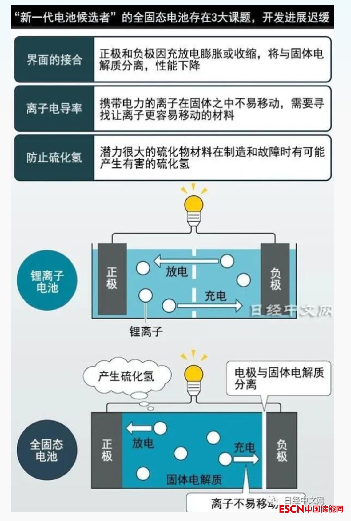 不過,《日經(jīng)中文網(wǎng)》在一篇最新的文章中最新指出,全固態(tài)電池最初被期待在2020年代前半期就搭載于純電動(dòng)汽車,但開發(fā)速度緩慢,目前看來,其量產(chǎn)仍然需要邁過三道難關(guān)。