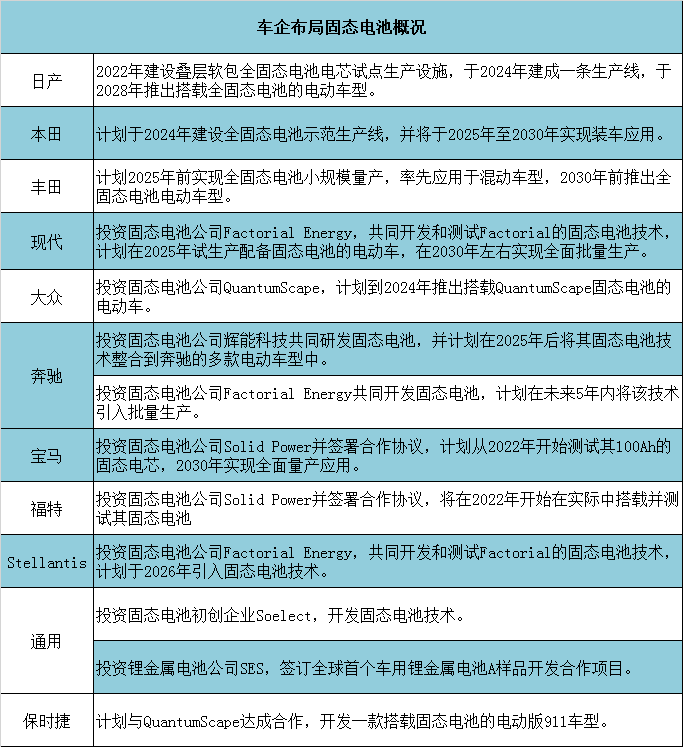 整體來看,主機(jī)廠在固態(tài)電池領(lǐng)域的布局持續(xù)升溫,是固態(tài)電池技術(shù)的投資主體,表明車企對下一代電池技術(shù)需求的急迫性。