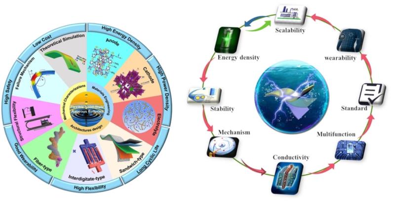 隨著科技的進步,高柔性、便捷和輕薄的柔性可穿戴電子設(shè)備是電子產(chǎn)品發(fā)展的主流方向。為了實現(xiàn)整個設(shè)備的可穿戴性,需要開發(fā)相匹配的高柔性、輕質(zhì)量及小體積的供能器件。水系電池,顧名思義采用水作為電解質(zhì)溶劑,可從根本上解決易燃有機電解質(zhì)引起的安全問題,避免有機體系嚴格的制造條件、昂貴的電解質(zhì)成本,并且從根本上改善了電池體系的快充特性。柔性固態(tài)水系電池以其能量密度高、安全性好、成本低等獨特的優(yōu)點,是柔性可穿戴電子設(shè)備的理想供能器件。如圖1所示,國內(nèi)外科研工作者對在柔性電極材料的制備、器件結(jié)構(gòu)的設(shè)計和柔性表征進行了大量的研究,促進了柔性固態(tài)水系電池的快速發(fā)展。