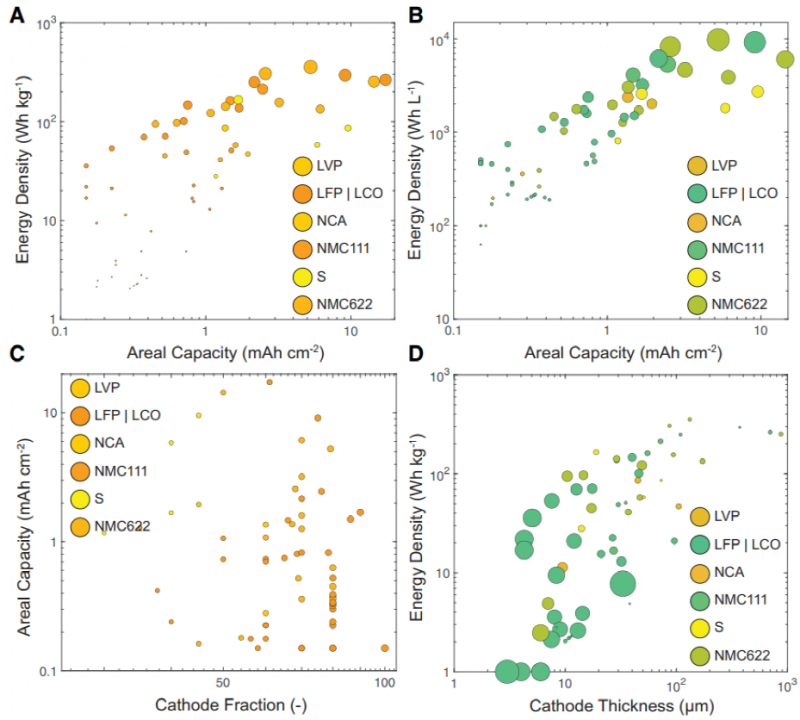 如圖5所示,SolidPAC可用于相關(guān)實驗參數(shù)的計算與預(yù)測,如陰極厚度、過量陽極含量、重量和體積能量密度(圖5)。圖5A和5B所示,重量和體積能量密度隨陰極面積容量的增加而增加,但與陰極化學(xué)無關(guān)。由于較大的SE厚度和低面積容量,大多數(shù)SSB的性能遠遠低于最新報道的鋰離子電池性能。然而,應(yīng)注意的是,與體積能量密度相比,重量能量密度顯示出更大的度量偏差。這是因為不同形狀的SSB(扣式電池、壓力電池、Swagelok電池),具有不一樣的電池體積,這樣會導(dǎo)致更大的質(zhì)量能量密度偏差。此外,圖5C所示,活性材料的比重和面積容量之間的相關(guān)性也顯示出不均勻分布,表明在給定的復(fù)合陰極配方中,陰極面積負載(mg cm-2)和厚度(mm)的數(shù)值范圍通常都比較大。圖5D所示,可以清楚地觀察到,在較低的過量陽極和較高的陰極厚度,可以獲得較高的能量密度。