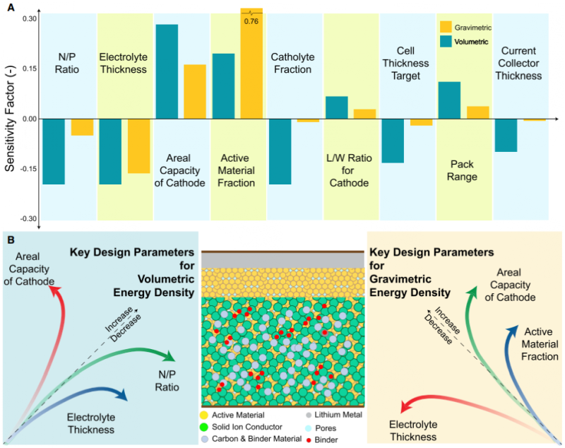 如圖4所示,研究人員使用公式圖片,對SolidPAC的靈敏度進行了分析,以便能夠調(diào)整電池相關(guān)參數(shù),獲得能量密度的最大化,其中Si為靈敏因子,EDfinal和EDinitial為擾動組和基態(tài)組的能量密度。對于質(zhì)量能量密度,活性物質(zhì)的含量是最敏感的因素,陰極的面積容量和電解質(zhì)厚度是重要的調(diào)整因素。相比之下,對于體積能量密度,陰極的面積容量是最敏感的因素,電解質(zhì)厚度、活性物質(zhì)分數(shù)、陰極電解質(zhì)分數(shù)和N/P比也顯示出高靈敏度。如圖4B所示,研究人員對一系列不同的材料組合進行了靈敏度分析,總體趨勢預(yù)期的結(jié)果一致。