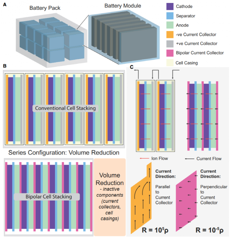 與傳統(tǒng)鋰電池相比,SSB的另一個重要特征是可以進行雙極堆疊串聯(lián)(圖2C、2D和3)。電池的雙極堆疊串聯(lián)能夠提高電池額定電壓,減少電池中的非活動元件(封裝、電氣連接等),從而提高電池能量密度。在模塊內(nèi),多個電池單元通過外部接線串聯(lián)或并聯(lián)。根據(jù)模塊內(nèi)的電池連接,電池結(jié)構(gòu)通常分為單極或雙極電池。單極結(jié)構(gòu)由正極和常規(guī)鋰離子電池組成,其中一個電池的負極片與下一個電池的正極片相連(圖3B)。這種設(shè)計,需要對單個電池進行密封和包裝,然后進行接線,以防止短路和電解液泄漏。