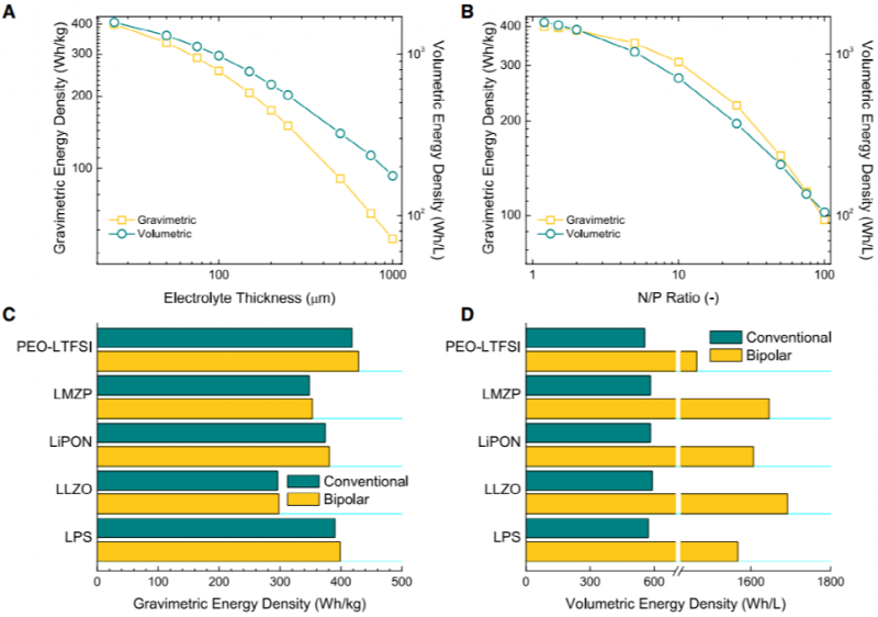 為了探索該工具包的功能,圖2A顯示了電池隔膜厚度對電池重量和體積能量密度的影響。當隔膜厚度為25 mm時,電池產(chǎn)生的能量密度為400 Wh kg-1和1550 Wh L-1,這與電動汽車應(yīng)用設(shè)計的SSB的擬定能量密度接近。大多數(shù)報告顯示,當隔膜厚度在100 mm范圍時,電池能量密度一般在150-250 Wh kg-1和550-950 Wh L-1范圍內(nèi),與傳統(tǒng)鋰鎳鈷鋁氧化物(NCA)石墨電池的能量密度比較相近(250 Wh kg-1和570 Wh L-1),而NCA/Gr Si電池的能量密度約400 Wh kg-1和700 Wh L-1。因此,要獲得電池級能量密度,將隔膜厚度保持在100 mm以下是至關(guān)重要。