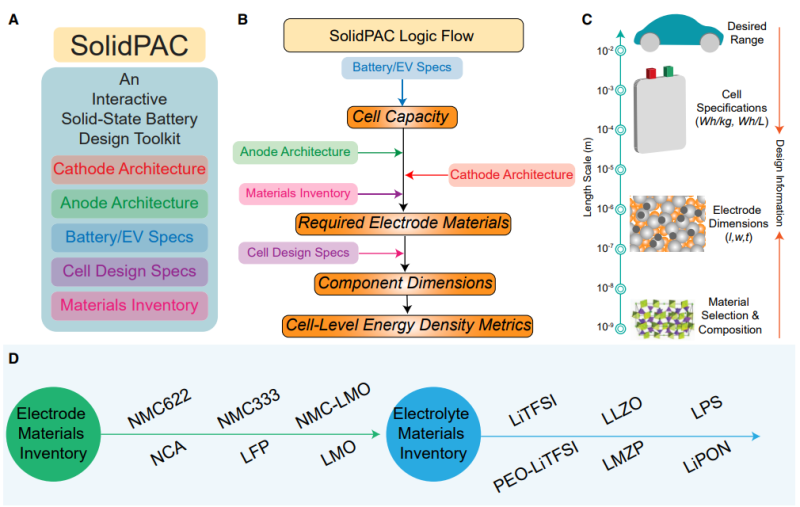 作為新一代具有高能量和高功率密度特征的固態(tài)電池,在可充電電池領(lǐng)域具有很好的應(yīng)用前景。而確定新興電池能否滿足實際應(yīng)用,達到與傳統(tǒng)鋰離子電池相當?shù)男阅埽芰棵芏冗@一性能指標至關(guān)重要。然而,現(xiàn)有的技術(shù)仍然無法全面的評估電池設(shè)計、電池組件與固態(tài)電池能量密度之間的內(nèi)在關(guān)系?;诖?,美國橡樹嶺國家實驗室Ilias Belharouak等人介紹了一種可用于固態(tài)電池性能全面分析的交互式實驗工具包(SolidPAC)。該工具包可根據(jù)用戶特定的應(yīng)用要求,設(shè)計出相應(yīng)的固態(tài)電池,幫助研究人員對電極材料性能和組分、電極厚度和負載、成本等因素進行合理優(yōu)化,并利用逆向工程概念,將電池能量密度輸出與材料和電池設(shè)計輸入有效地關(guān)聯(lián)起來。