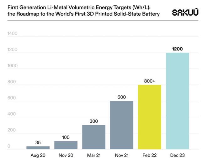 Sakuu稱,這一成就是實現(xiàn)在2023年制備超過1,200Wh/L的全3D打印固態(tài)電池(SSB)目標前的重要一步,所含有的能量密度遠遠高于當今市場領(lǐng)先的鋰電池。(目前市場常見的鋰電池的能量密度在500-700Wh/L范圍內(nèi)。)