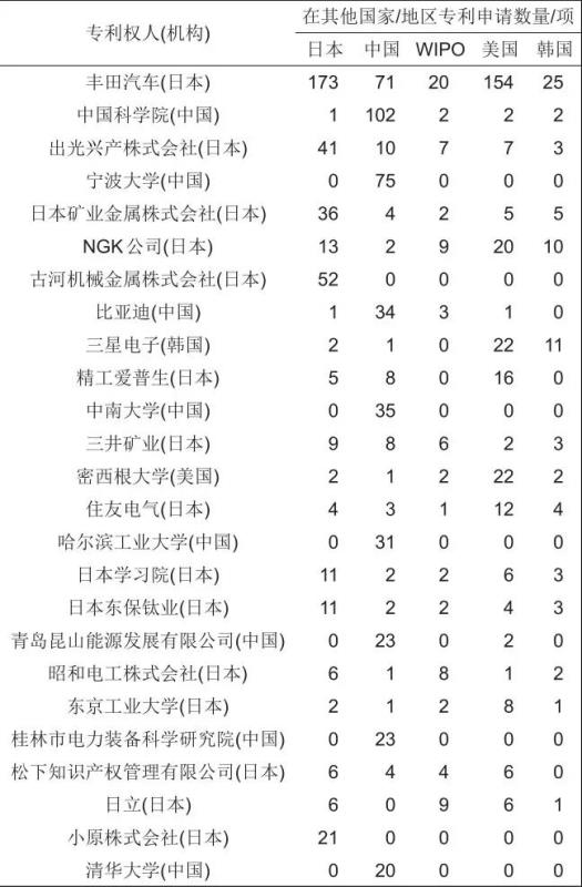 表3 全固態(tài)鋰電池技術(shù)專利權(quán)人(機構(gòu))及其專利申請時間分布情況