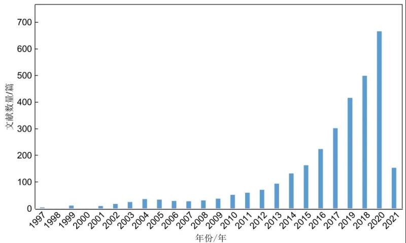 本次分析利用Web of Science數(shù)據(jù)庫檢索獲得了全球全固態(tài)鋰電池技術(shù)相關(guān)文獻數(shù)據(jù)集,Web of Science數(shù)據(jù)庫采集時間段為1900—2021年,共得到相關(guān)文獻數(shù)量3120篇。