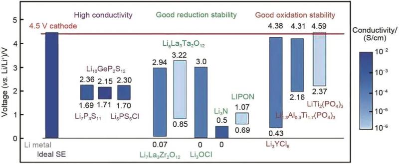 其中電解質(zhì)界面穩(wěn)定性對全固態(tài)鋰電池長循環(huán)壽命至關(guān)重要。不同電解質(zhì)氧化和還原極限如圖2所示。目前還沒有一種電解質(zhì)材料既具有高氧化極限又具有低還原極限。