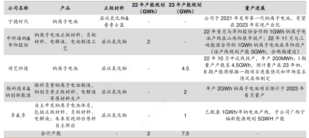 2023年預(yù)計(jì)投產(chǎn)鈉離子電池情況: