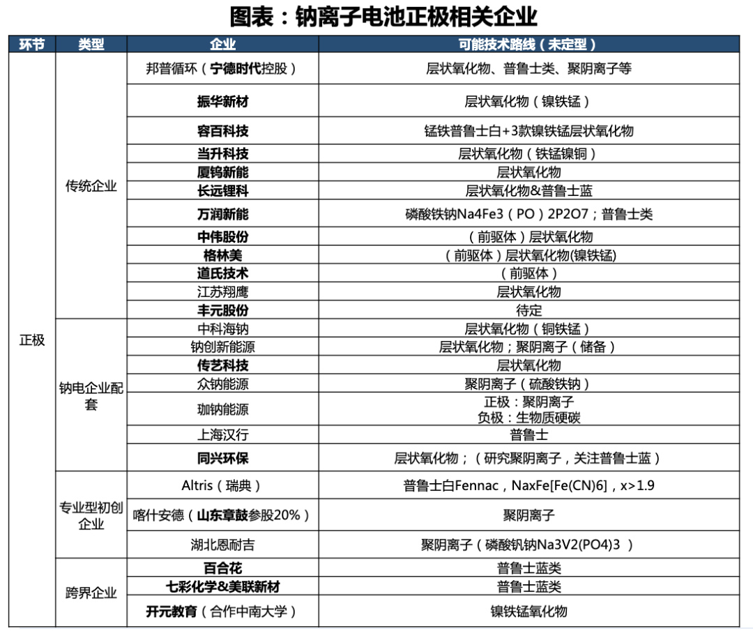 三條正極材料路線中,普魯士藍(lán)類似物是鈉電池的特有體系,需要特定的產(chǎn)業(yè)化配套,層狀金屬氧化物和聚陰離子化合物分別與三元電池和磷酸鐵鋰電池同體系,均有良好的產(chǎn)業(yè)化基礎(chǔ),傳統(tǒng)鋰電廠、正極材料廠商、專注鈉電研究的科創(chuàng)型團(tuán)隊(duì)在鈉電正極方面均有布局,進(jìn)展順利。