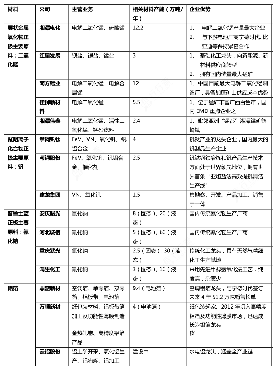 鈉離子電池產(chǎn)業(yè)鏈?zhǔn)巧嫌卧牧?。相關(guān)企業(yè)主要包括攀鋼釩鈦、河鋼股份、建龍集團(tuán)和華陽(yáng)股份等;鋁箔企業(yè)包括鼎盛新材、萬(wàn)順新材、南山鋁業(yè)和云鋁股份等;氰化鈉相關(guān)企業(yè)包括安慶曙光、河北誠(chéng)信、重慶紫光等;二氧化錳相關(guān)企業(yè)包括湘潭電化、紅星發(fā)展等。