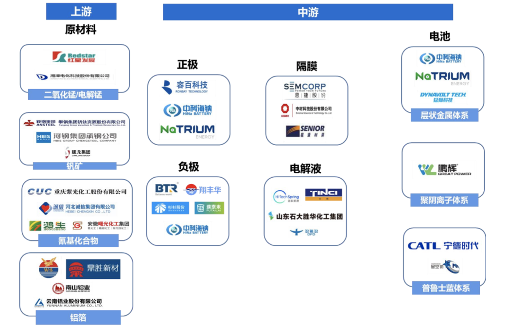 鈉離子電池產(chǎn)業(yè)鏈結(jié)構(gòu)與鋰電類似,包括上游資源企業(yè)、中游電池材料及電池電芯企業(yè)。